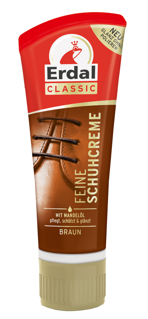 Erdal brūns apavu krēms tūbiņā ar īstu mandeļu eļļu. Baro un kopj visu gludu un mākslīgo ādu. Atjauno krāsas, nosedz skrāpējumus un nodiluma zīmes un nodrošina spīdumu. Lietošana: Vispirms no apaviem notīriet visus putekļus un netīrumus. Pēc tam uzklājiet plānu vienmērīgu kārtu un maigi ieberiet. Ražots Vācijā.