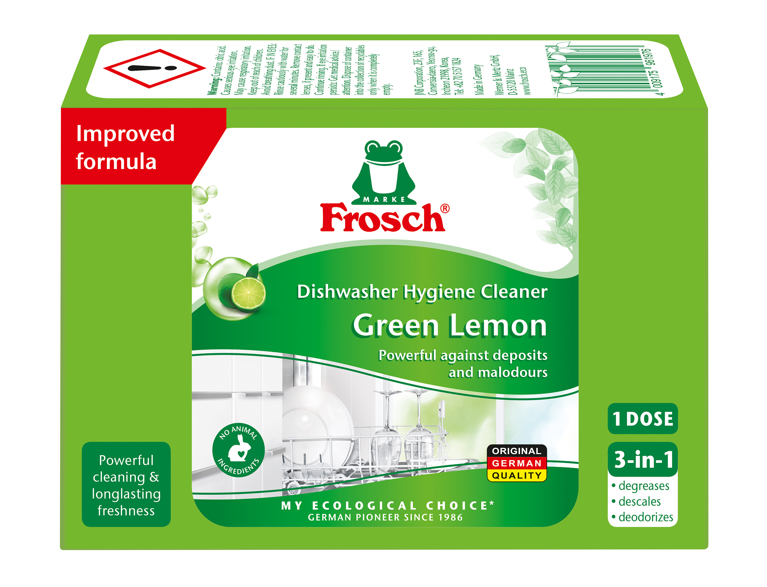 Užtikrina galingą ir higienišką visų indaplovių valymą, išvalo net sunkiai pasiekiamas vietas, tokias kaip purkštukai, filtrai ar nutekėjimo angos. Galinga formulė su žaliąja citrina pašalina kalkių nuosėdas, riebalus ir nemalonius kvapus, palaiko indaplovės veikimą ir apsaugo jos dalis. Naudojimas: į tuščios indaplovės ploviklio dozatorių suberkite miltelius, likusius miltelius paskirstykite ant indaplovės dugno. Įjunkite programą ne žemesnėje kaip 60 °C temperatūroje. Naudokite indaplovių higieninį valiklį tik be indų. Skirta vienam naudojimui. Atsargiai! Sukelia smarkų akių dirginimą. Gali dirginti kvėpavimo takus. Laikyti vaikams neprieinamoje vietoje. Stengtis neįkvėpti dulkių. PATEKUS Į AKIS: atsargiai plauti vandeniu kelias minutes. Išimti kontaktinius lęšius, jeigu jie yra ir jeigu lengvai galima tai padaryti, toliau plauti akis. Jei akių dirginimas nepraeina – kreiptis į gydytoją. Talpyklą priduoti į antrinių žaliavų surinkimo punktą tik visiškai tuščią. Sudėtis: <5 % nejoninių aktyviųjų paviršiaus medžiagų, kvapiosios medžiagos, LIMONENE. Pagaminta Vokietijoje.