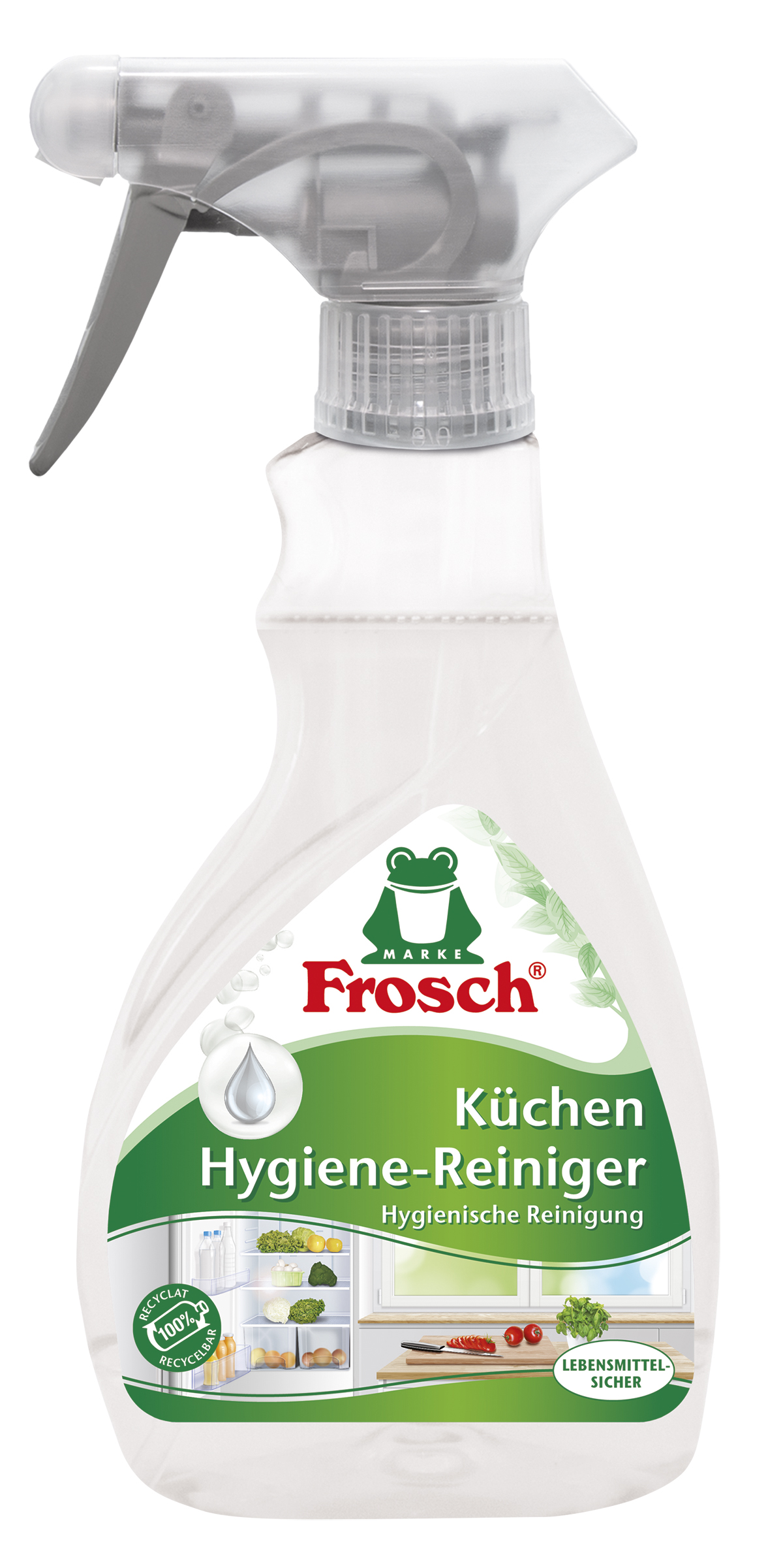 Frosch higieninis virtuvės valiklis su natūraliu kadagių ekstraktu. Skirtas visiems virtuvės paviršiams valyti. Valiklis tinka su maistu besiliečiantiems paviršiams valyti, taip pat – darbiniams paviršiams, mikrobangų krosnelėms, šaldytuvams. Efektyviai pašalina nešvarumus ir maisto likučius. Naikina nemalonų kvapą. Naudojimas: pasukite kamštelį, kol purškiklio galvutės simbolis atsiras viršuje. Valiklį užpurkškite ant valomo paviršiaus, leiskite priemonei suveikti ir nuvalykite sausa šluoste. Laikyti vaikams neprieinamoje vietoje. Norėdami nuvalyti lengvai pažeidžiamą paviršių – prieš tai išmėginkite valiklį nepastebimoje vietoje. Sudėtis: kvapai, BENZYL ALCOHOL. Pagaminta Austrijoje.